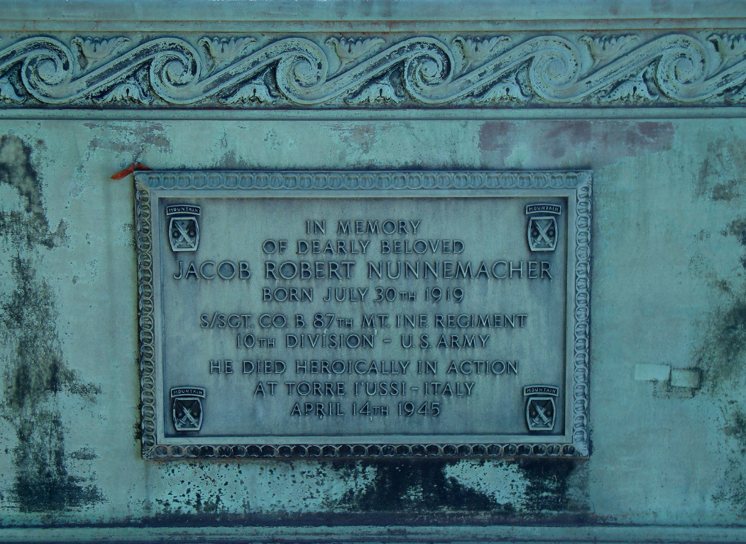 By 1000 hours on the 14th, Nunnemacher and the 1st Platoon of Company B had cleared one town and was taking more German prisoners in the town of Torre Iussi while coming under constant sniper fire. While checking a house, Staff Sergeant Jacob Nunnemacher was killed by a sniper bullet. [Read a full account of the 87th Mountain Infantry of the 10th Mountain Division]: